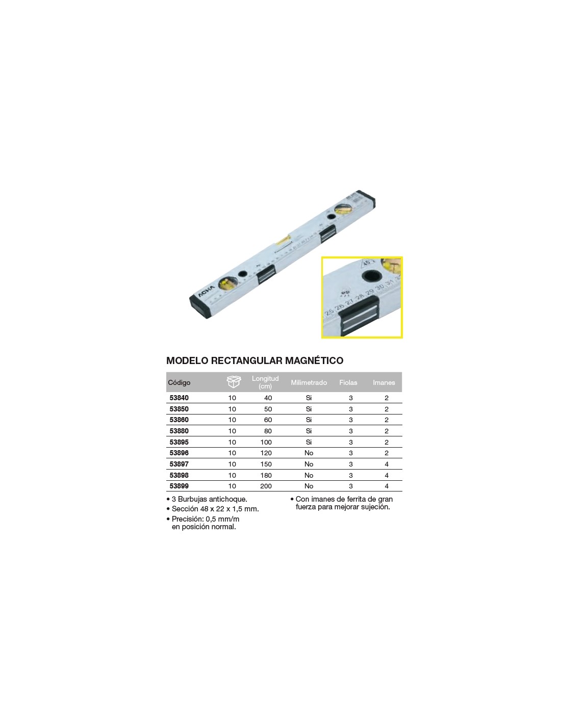 Características 3 Burbujas antichoque. Sección 48 x 22 x 1,5 mm. Precisión: 0,5 mm/m en posición normal. Con imanes de ferrita de gran fuerza para mejorar sujeción. CALIDAD SUPERIOR: Líderes en el sector. Herramientas pensadas para el nivel más alto de exigencia y dirigidas para lograr su completa satisfacción. Productos con disponibilidad inmediata. Servicio 24 horas. No duden en solicitar más información o ficha técnica. GARANTÍA: Todos los productos del catálogo de Acha están garantizados contra cualquier defecto de material o fabricación, no cubriendo los daños debidos a un uso incorrecto o deficiente, desgaste normal o mala conservación. Esta garantía cubre exclusivamente la reparación o reposición de la pieza defectuosa, y no cubrirá otros conceptos como el transporte, ni cualquier otro daño o perjuicio.