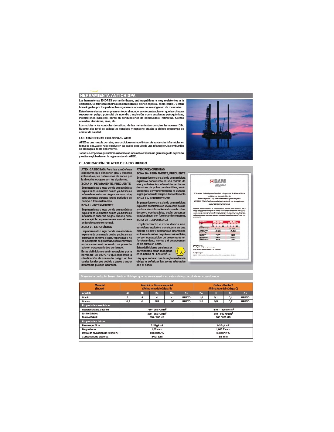 HERRAMIENTA ANTICHISPA, ANTIMAGNÉTICA Y MUY RESISTENTE A LA CORROSIÓN. Se fabrican con una aleación (aluminio-bronce especial, cobre-berilio), y están homologadas por los pertinentes organismos ofi ciales de investigación de materiales. Estas herramientas se emplean en todo el mundo en circunstancias en que las chispas suponen un peligro potencial de incendio o explosión, como en plantas petroquímicas, instalaciones químicas, obras en conducciones de combustible, refi nerías, fuerzas armadas, destilerías, silos, etc. Los moldes y los controles de calidad de las herramientas cumplen las normas DIN. Nuestro alto nivel de calidad se consigue y mantiene gracias a dichos programas de control de calidad. LAS ATMÓSFERAS EXPLOSIVAS - ATEX ATEX es una mezcla con aire, en condiciones atmosféricas, de sustancias inflamables en forma de gas,vapor, nube o polvo en las cuales después de una inflamación, la combustión se propaga al resto del entorno. Todas las empresas que utilizan substancias inflamables tienen un gran riesgo de explosión y están englobadas en la reglamentación ATEX. Herramientas certificadas por el Instituto Federal para el Análisis e Inspección de Material BAM CALIDAD SUPERIOR: Líderes en el sector. Herramientas pensadas para el nivel más alto de exigencia y dirigidas para lograr su completa satisfacción. Productos con disponibilidad inmediata. Servicio 24 horas. No duden en solicitar más información o ficha técnica. GARANTÍA: Todos los productos del catálogo de Acha están garantizados contra cualquier defecto de material o fabricación, no cubriendo los daños debidos a un uso incorrecto o deficiente, desgaste normal o mala conservación. Esta garantía cubre exclusivamente la reparación o reposición de la pieza defectuosa, y no cubrirá otros conceptos como el transporte, ni cualquier otro daño o perjuicio.