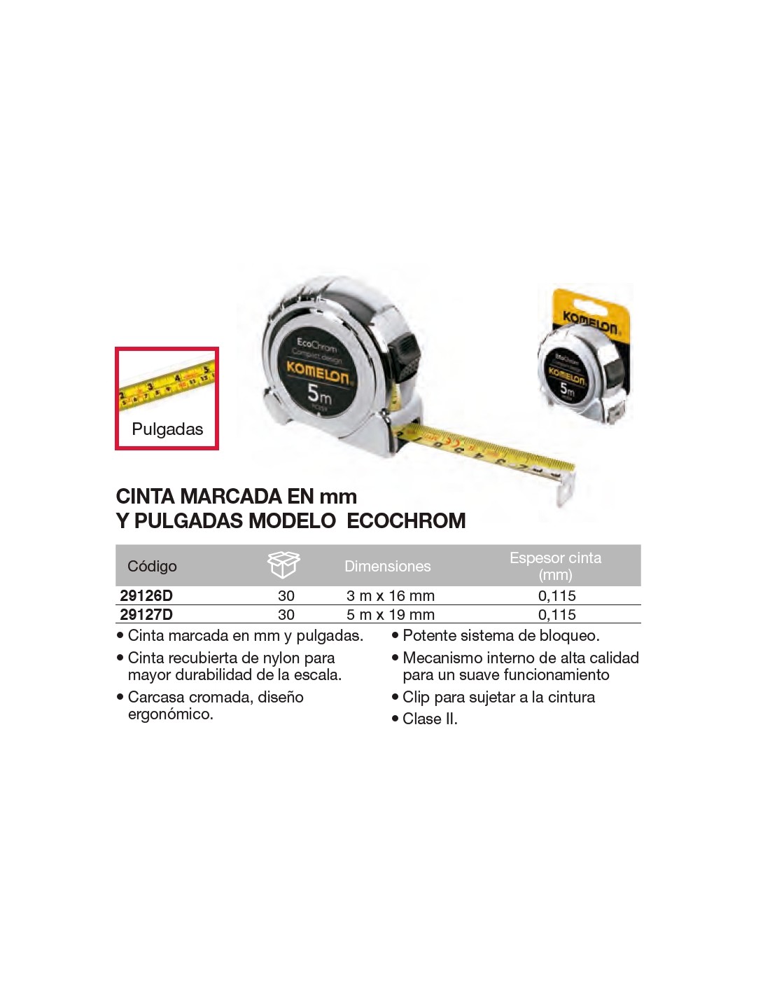 Flexómetro con cinta en mm. y pulgadas.Carcasa cromada mod. "EcoChrom" 5m x 19mm