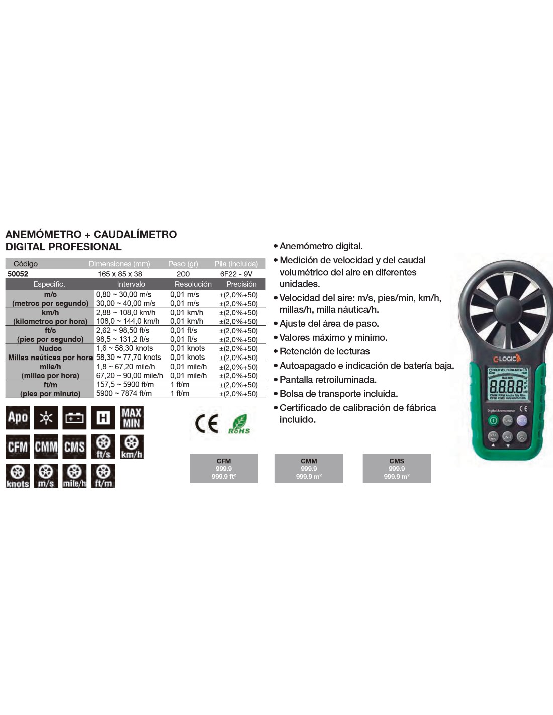 Anemómetro + Caudalímetro digital 165x85x38 mm
