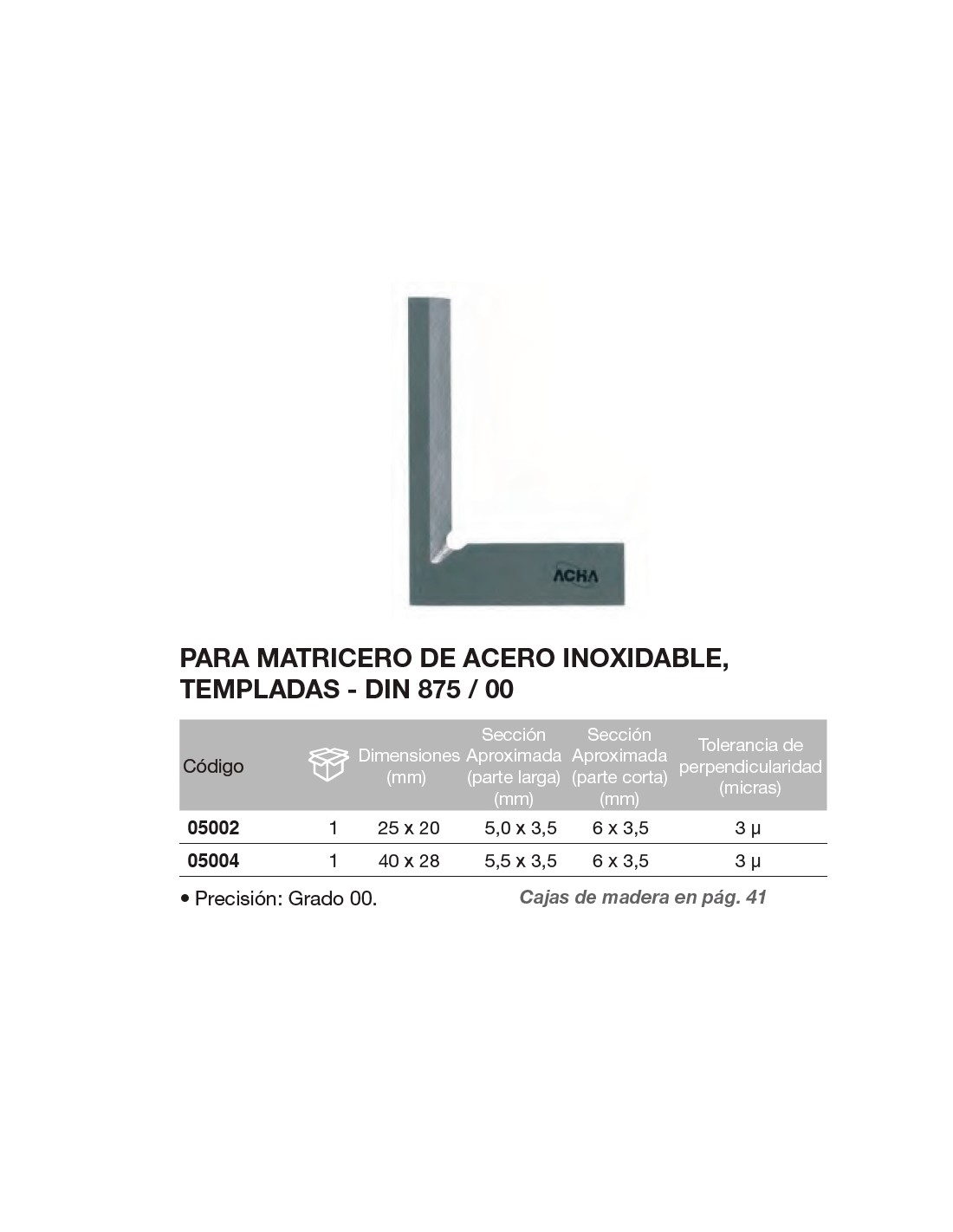 Escuadra DIN 875/00 para matricero de acero inox., templada 40 x 28mm