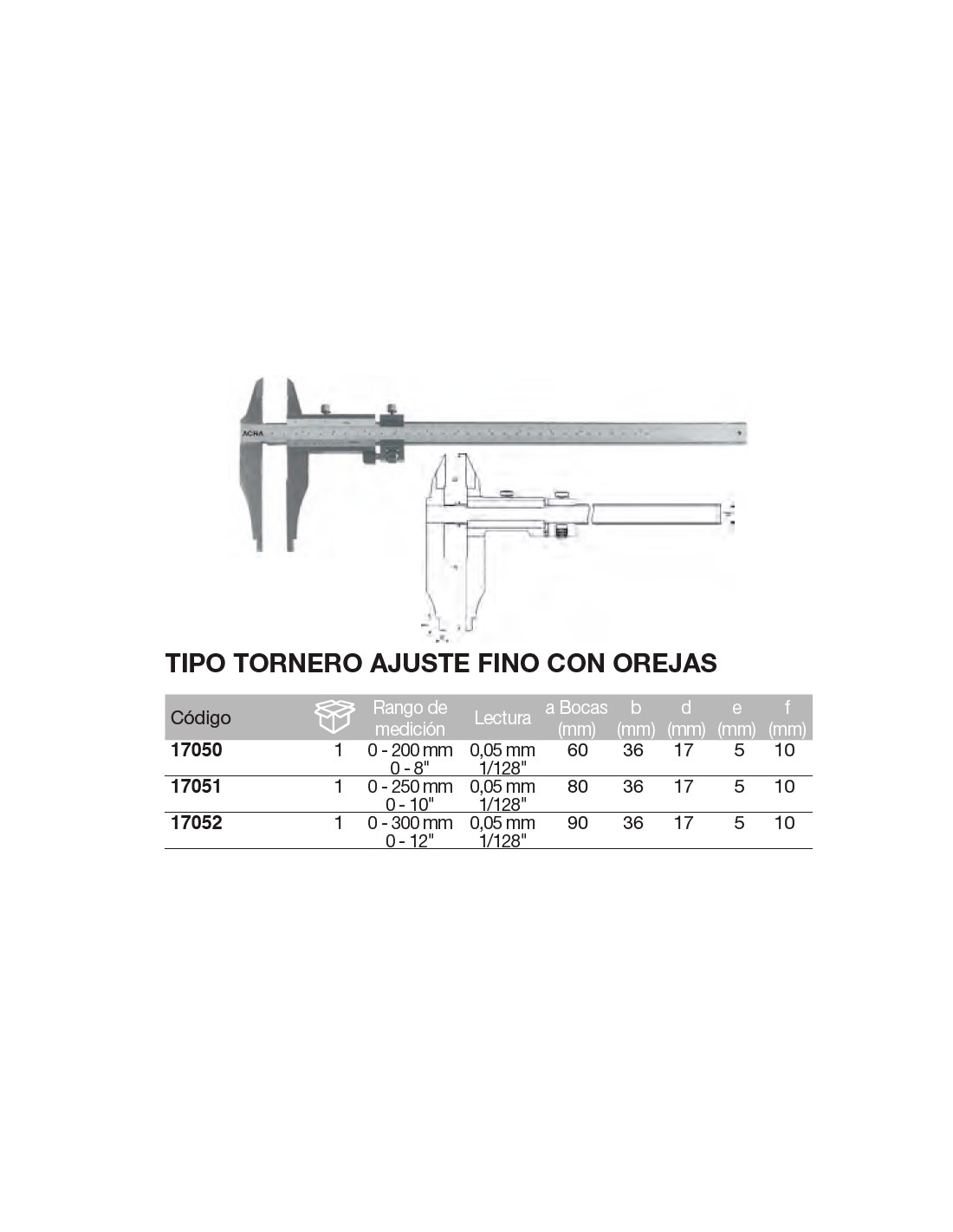 Calibre tipo tornero. Orejetas. Ajuste fino. Acero inox. cromado mate 200 x Boca 60