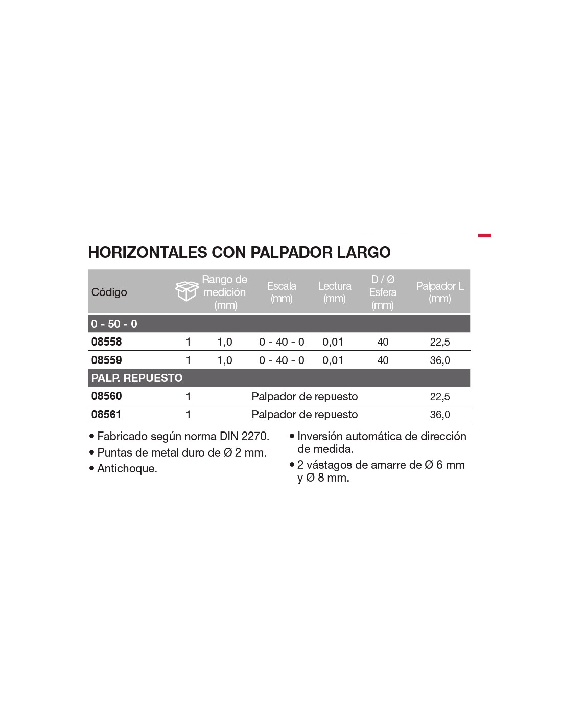 Reloj comparador con palpador largo orientable 1/0,01/Ø40/Palp.22